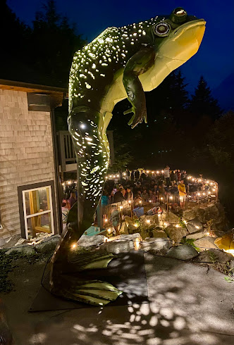 Four meters tall, leaping in the air, and designs cut out with light shining through. The frog is painted with professional industrial enamel paints.
